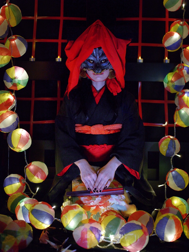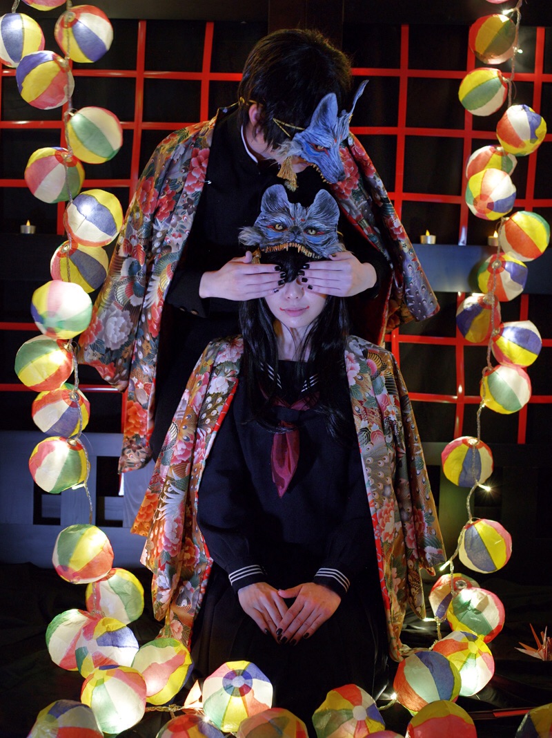 制作した狐面を使用して写真を撮影しました。